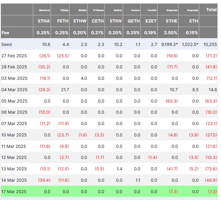 The performance of Ether ETFs was negative throughout the month, with only one exception: March 4 when there were inflows exceeding $14 million. The performance of spot Ether funds was poor throughout the month, as they lost over $300 million.