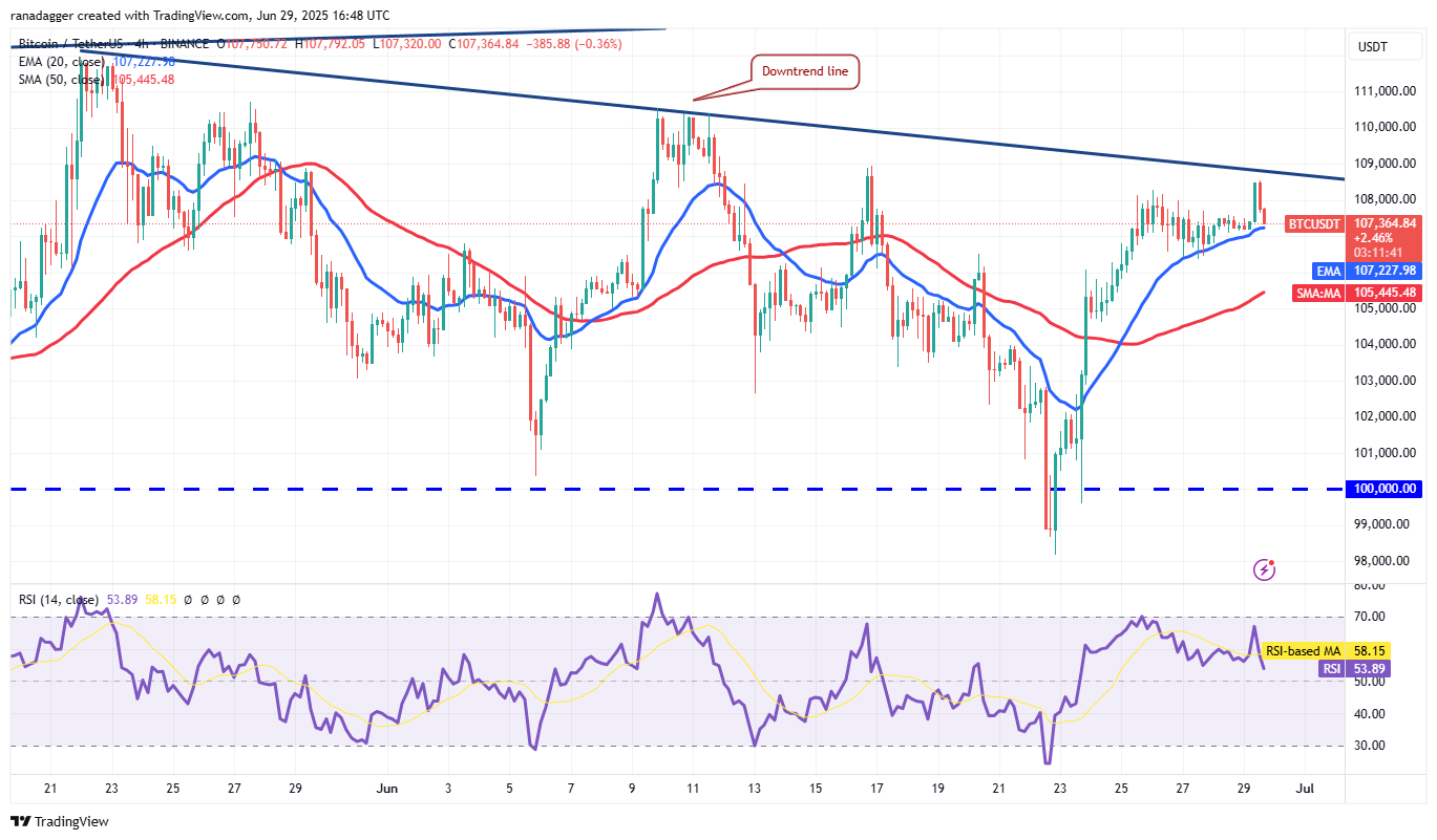 Moving averages slope up slowly, while the relative strength indicator (RSI), which indicates that bulls hold a slight advantage, is also in positive territory. The BTC/USDT could reach $110,530 or even $111,980 if bulls push it over the downtrend.