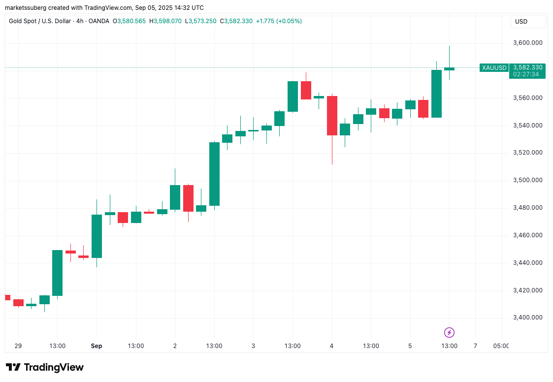 BTC’s price drops all of its gains, while gold continues to reach new highs.