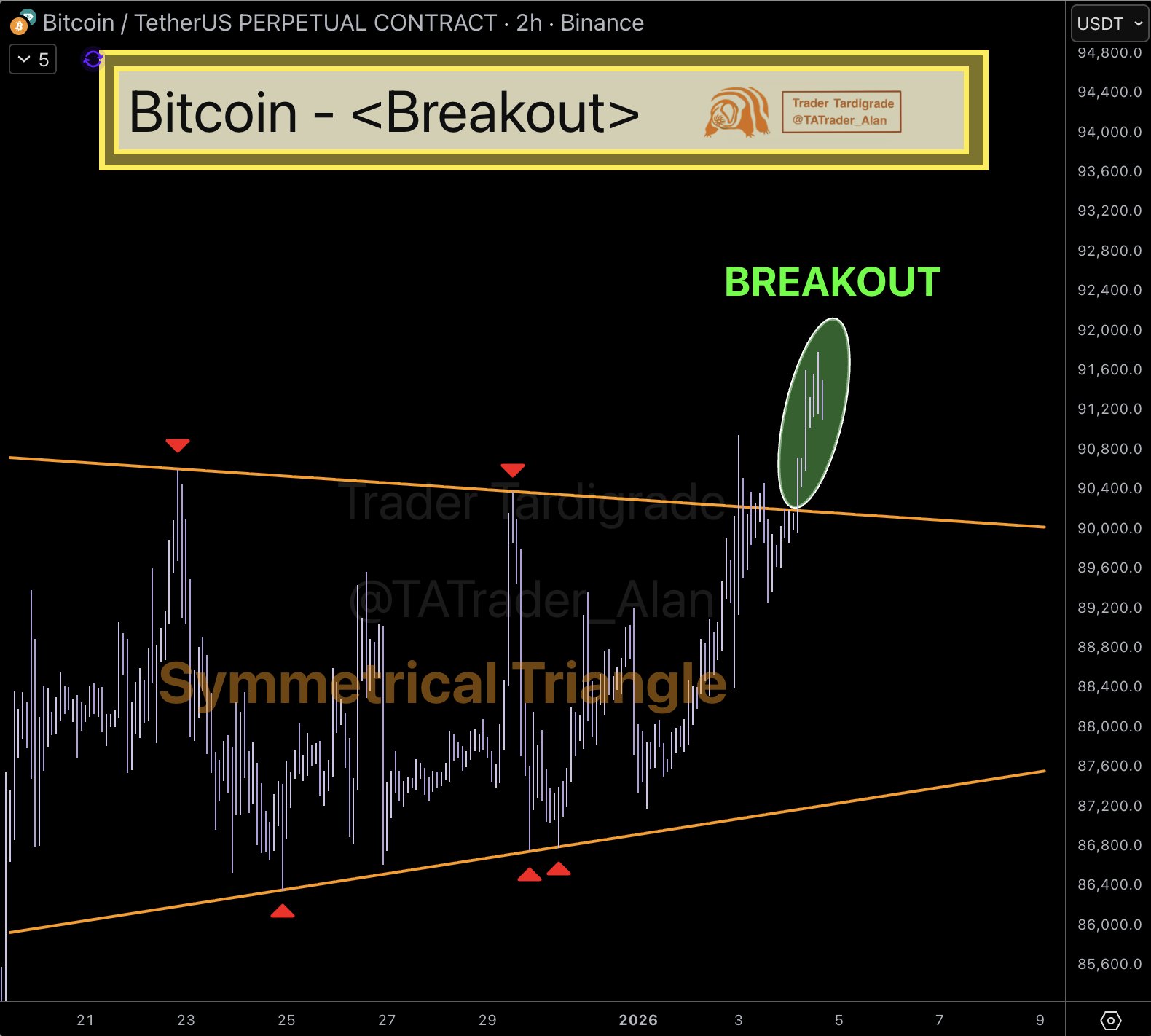 Alan Tardigrade hints that change is finally on its way reported BTC/USD has now broken out of a triangle formation on two-hour timespan. A chart with the accompanying data showed that $90,000.00 was the critical level.