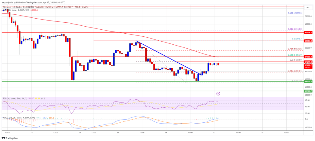 Price is now trying to recover from a recent low formed at $61,551. The hourly chart for the BTC/USD pairs showed a break over a bearish line that connected to resistance at $63,000. The pair rose above the level where the 23.6% Fib was retracement of the recent fall from the swing high at $66,898 down to the low at $61,551