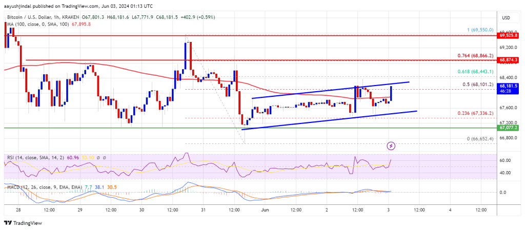 Bulls were able push the price up to $68,000. The price even soared over the 50% Fib level of the decline from the swing high $69,550 to the low $66,652. Bitcoin is currently trading at a price above $68,000, and also the Simple Moving Average 100-hourly.