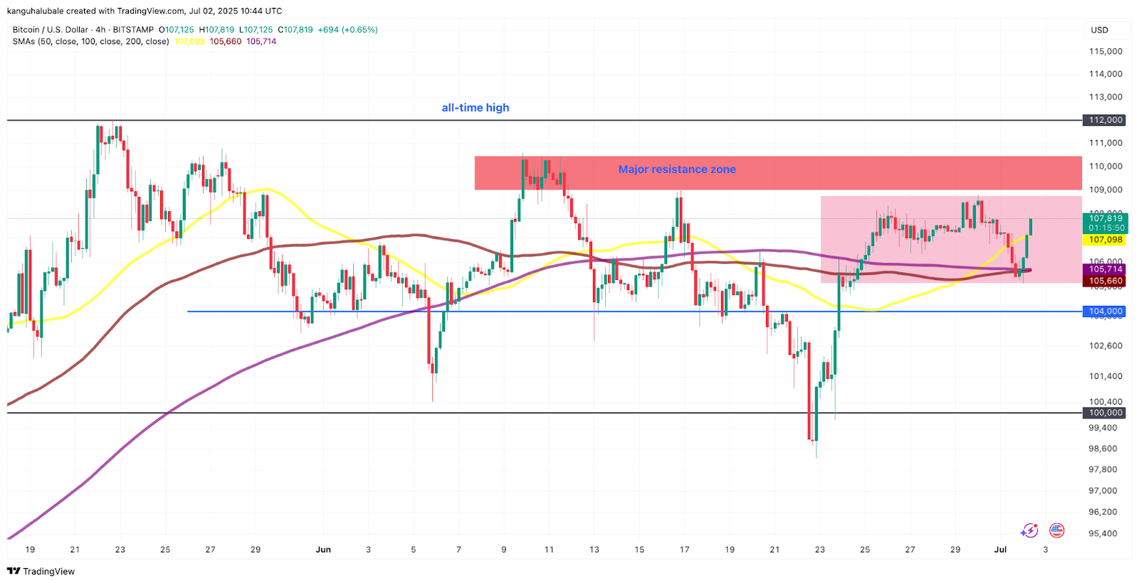 “A break and a four-hour close above $109K and ATHs are on the cards.”