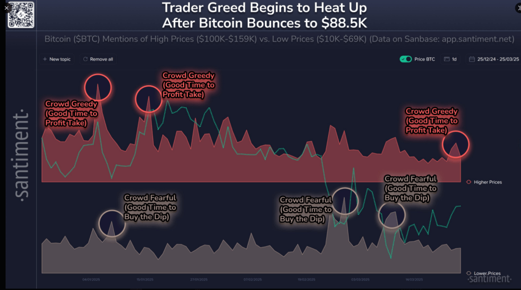 Early in the year, traders also held back when Bitcoin dropped to $78,000. The recent surge back up to $88,500 has changed general perception. Santiment believes that this could be a great time to sell.