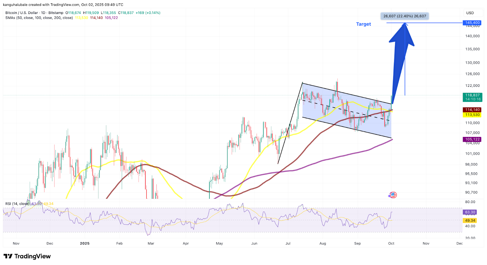 BTC’s price is set to hit $145,000 over the next couple of months, according to a chart with a classic pattern.