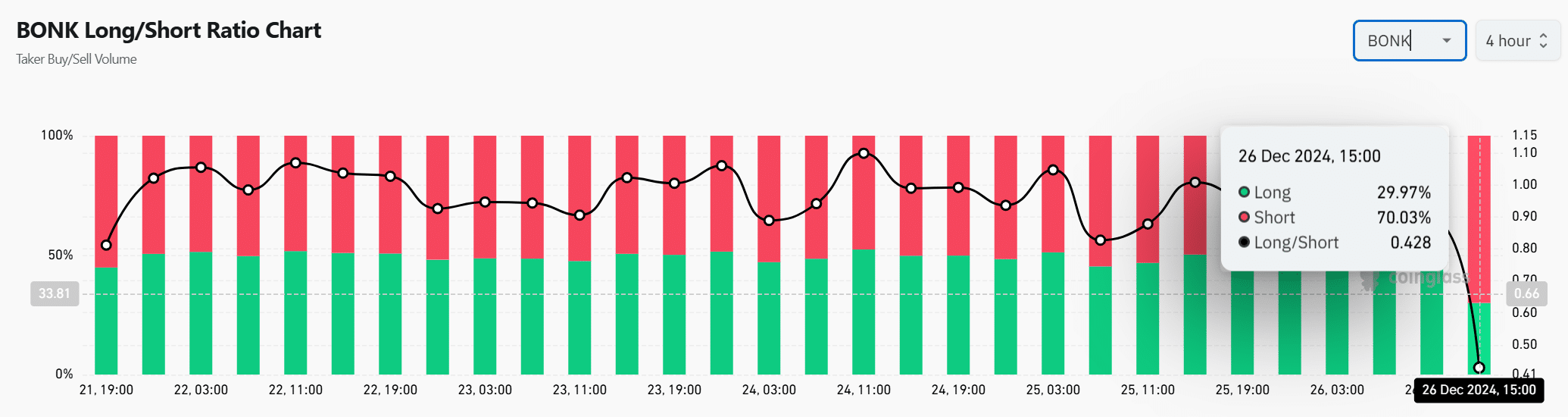 Although the BonkDAO token burn reduces BONK supply, the current negative sentiment, which is reflected by Social Volume, Short/Long Ratios and weak technical indicator, suggests that this deflationary measure would not cause a significant rally in price in the short-term.