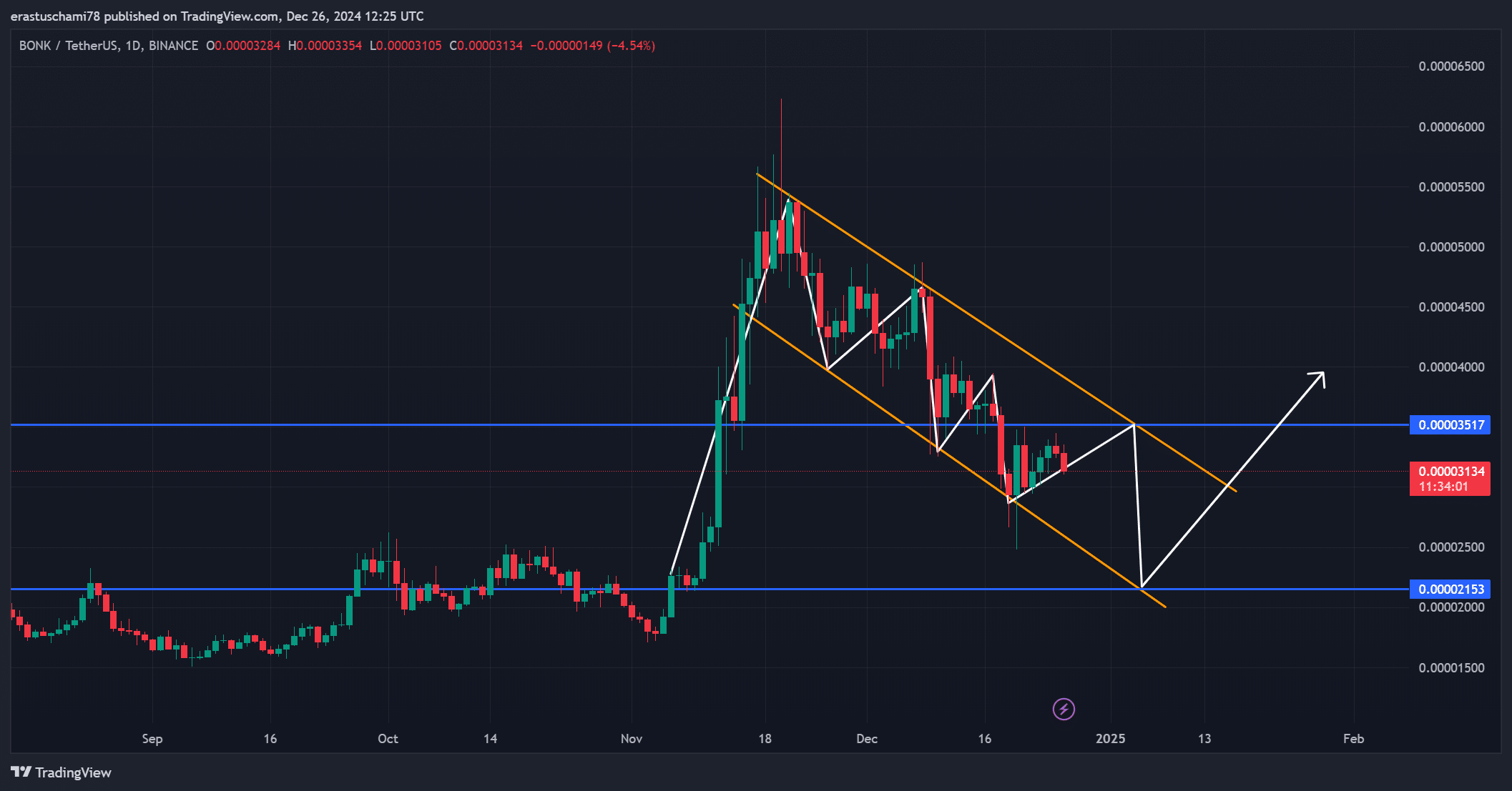 BONK is currently trading for $0.00003144, but it will be difficult to break through the resistance without more market support.