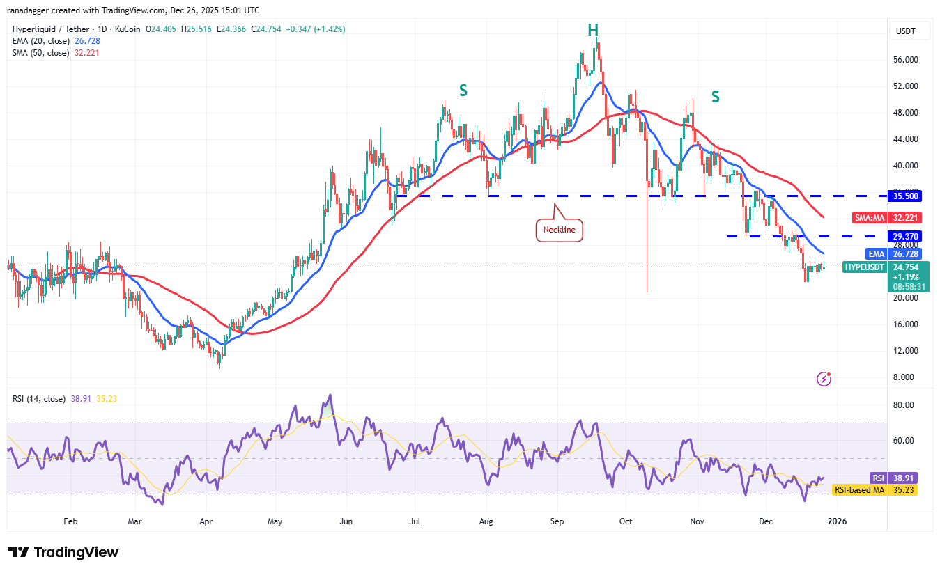 Hyperliquid (HYPE), although it remains below its 20-day EMA of $26,72, has failed to drop below the $22,19 support.