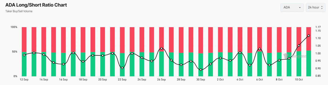 ADA’s sentiment remains positive and could help to prevent a steep price decline. For instance – The long/short ratio shot up to its highest level since early September. The long/short ratio is a good indicator that traders expect future price growth.