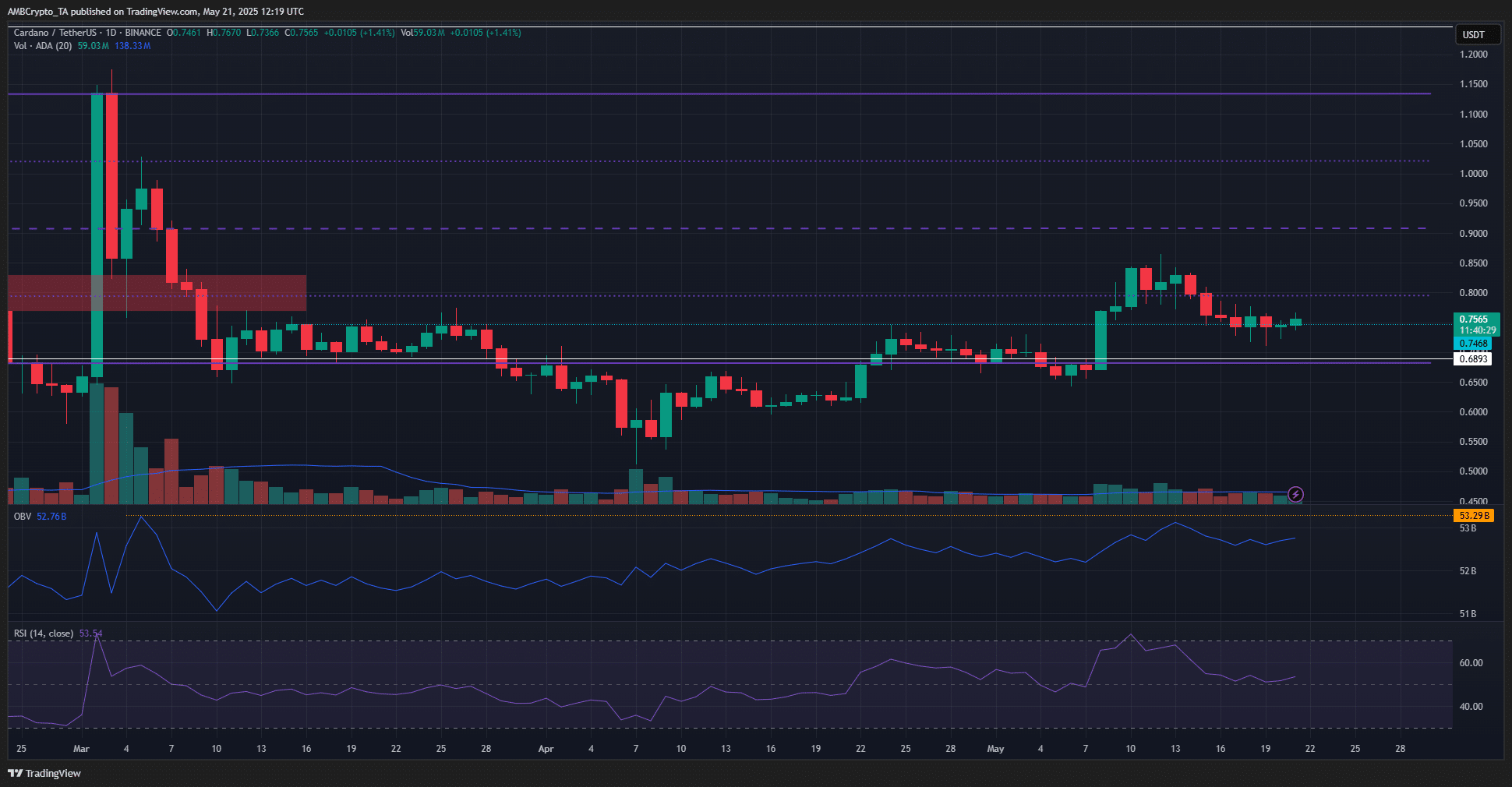 The RSI retested the neutral 50 support and seemed to be moving higher. If the ADA prices can move higher, this would signal a movement towards the middle-range resistance of $0.9.