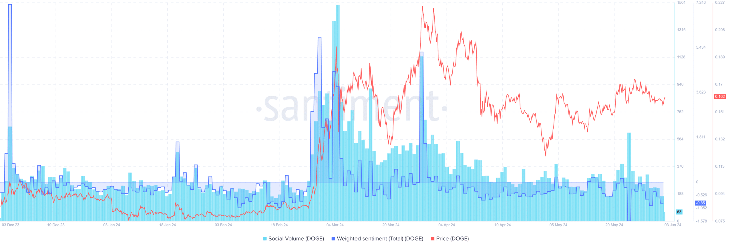 AMBCrypto analysed Santiment’s social volume, weighted sentiment and market sentiment. Market sentiments showed that Dogecoin’s bearishness was similar to that of early March just before a massive price increase. This suggests that another surge could be expected in the future.