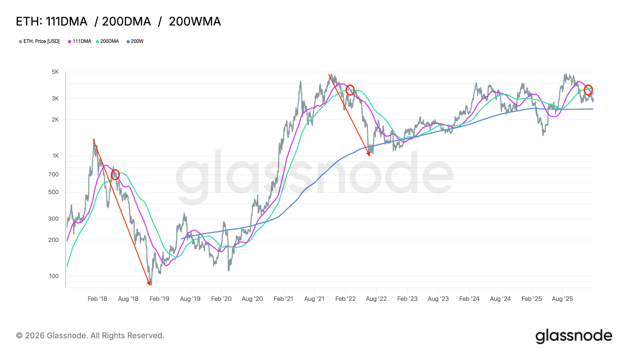Chart technicals shows the 111-day MA is trading below 200-day MA. Chart below shows how similar crossovers triggered a deeper ETH drawdown during 2018 and 2022’s bear markets.