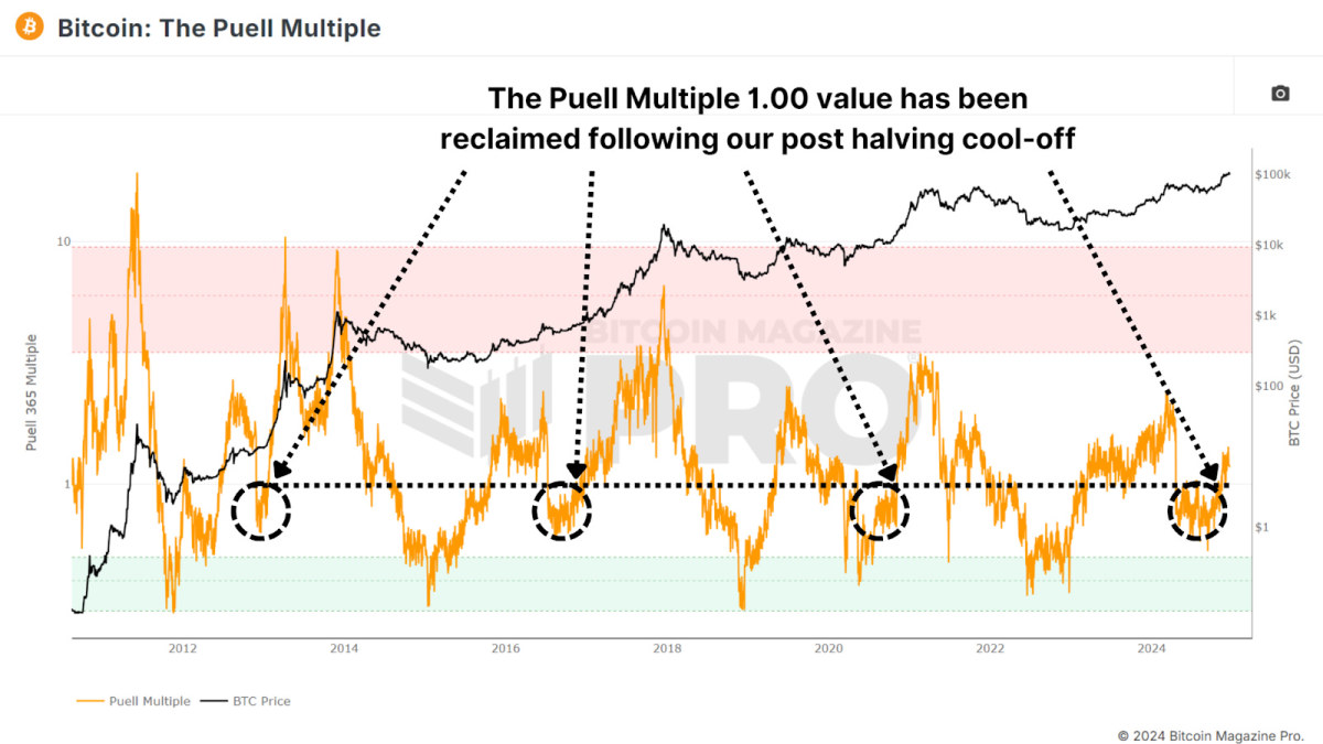 The Puell Multiple This metric compares the daily miner revenues (in USD) to their 365-day average. Miners’ revenue dropped sharply after the event of halving, resulting in a consolidation period.
