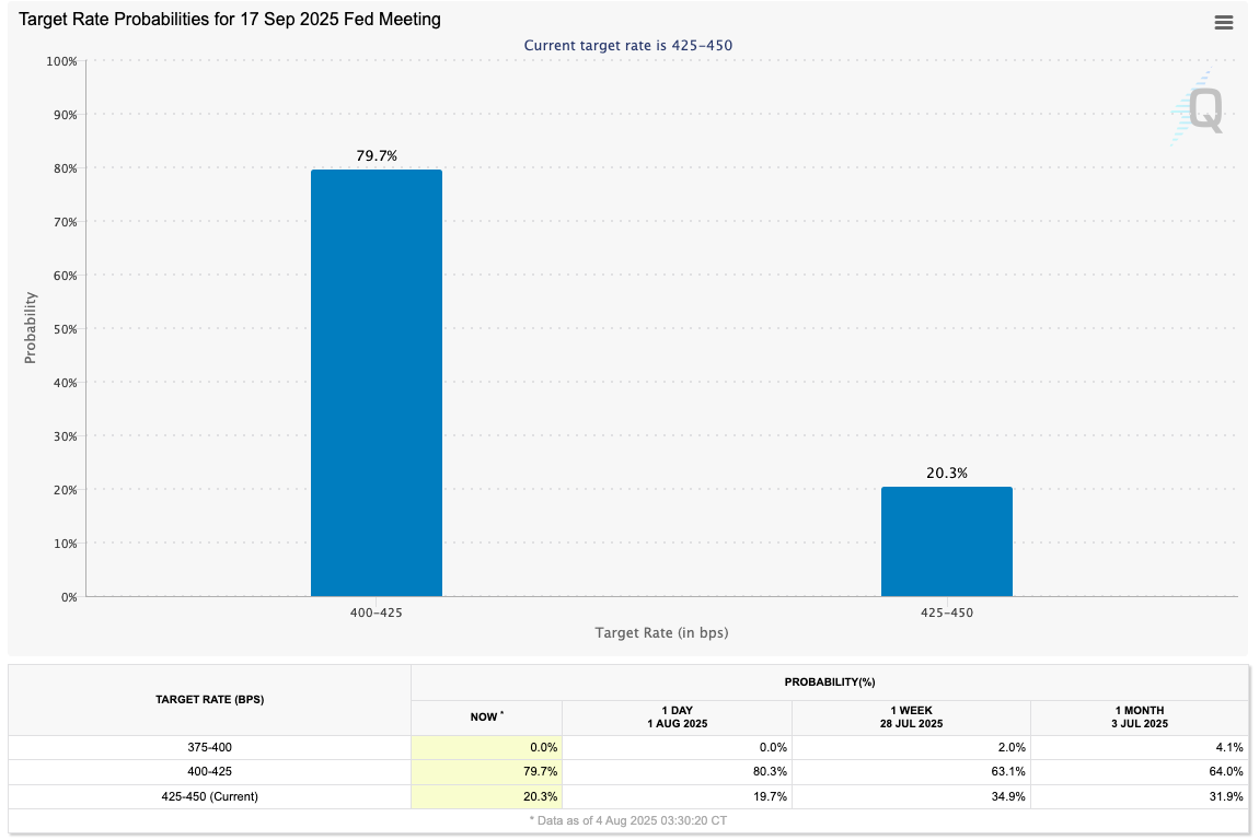 CME Group data shows that the market expectations have shifted, and are back in favor of a 0.25% initial cut during September’s Fed meeting. FedWatch Tool.