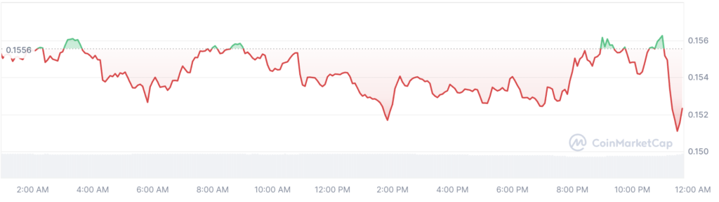 External factors have caused the cryptocurrency market to be volatile. Dogecoin also sank in waves of volatility. DOGE dropped by 4% in the last seven days, while most assets had a steady week. DOGE has had a difficult month as well, with a drop of 12.63%. The meme coin continued to decline by 1.21% in the past 24 hours. DOGE traded at $0.1534 when this article was written.