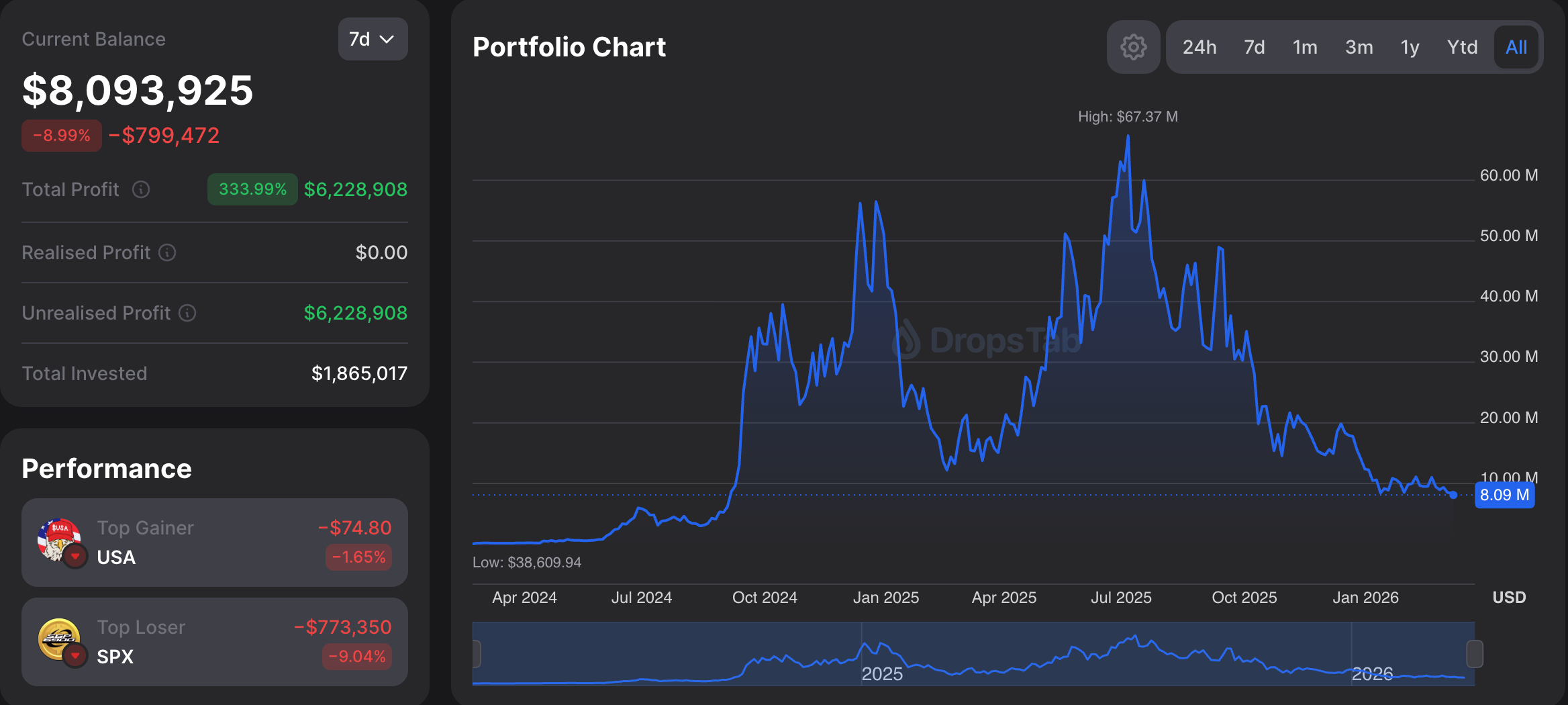 Since then, the drop amounts to a loss unrealized of approximately $60 million. The broader memecoin industry, which includes SPX, has corrected more than 80% since its peak.