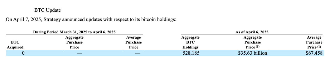 According to the filing, Strategy has not sold any class A common shares between March 31 and April 6 that it uses for funding its Bitcoin buying.