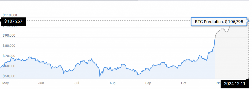 “According to our current Bitcoin price prediction. The price of Bitcoin is predicted to rise by 21.22% and reach $ 106,795 by December 11, 2024. Per our technical indicators, the current sentiment is Bullish while the Fear & Greed Index is showing 69 (Greed). Bitcoin recorded 18/30 (60%) green days with 5.44% price volatility over the last 30 days. Based on the Bitcoin forecast, it’s now a good time to buy Bitcoin.”