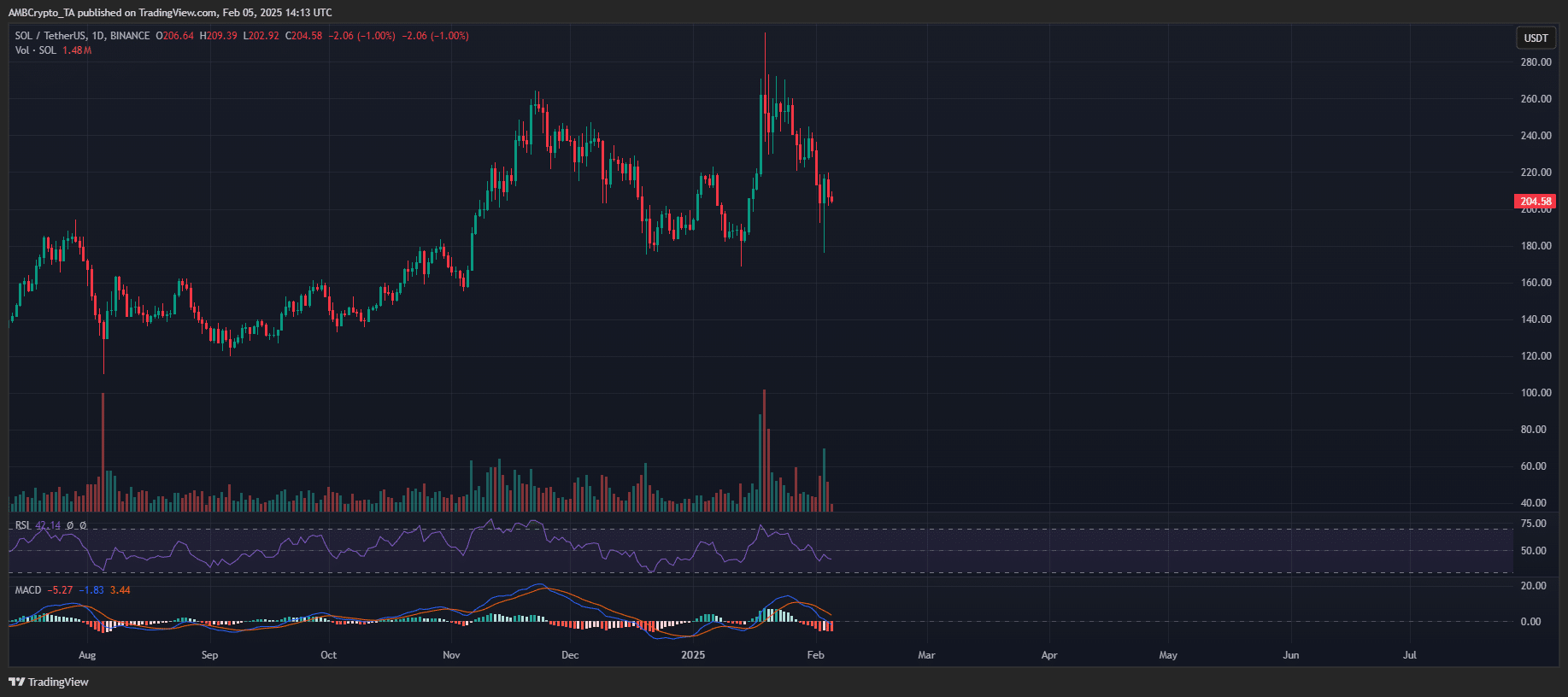 SOL/BTC is still in consolidation mode in 2024. There are no visible signs of an upswing. The launch of TRUMP memecoin, a major event in the crypto-world, hasn’t been able to generate lasting momentum.