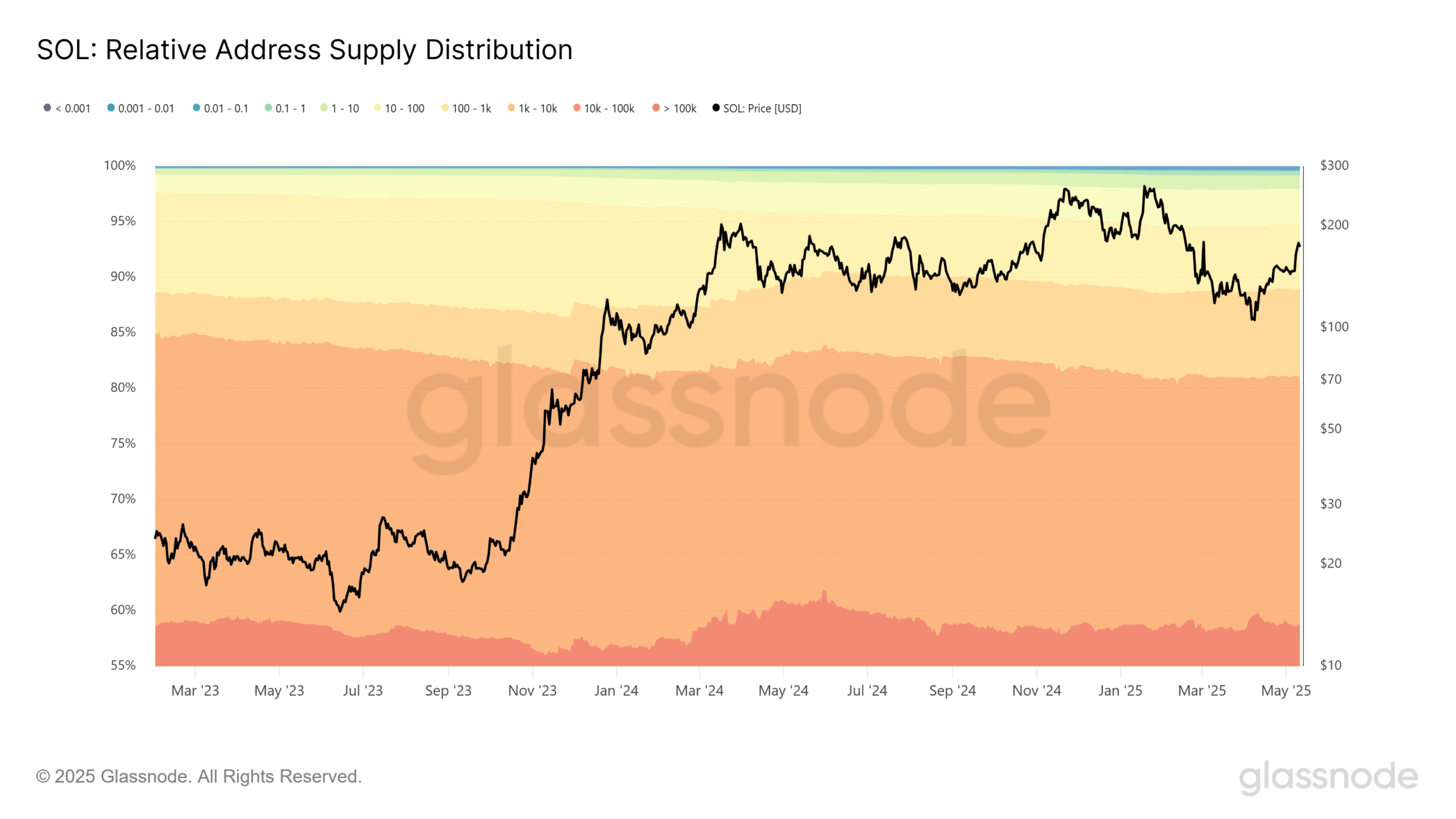 In spite of the enormous potential, the distribution of relative addresses did not reveal a significant accumulation. The Solana supply metric is used to track the amount of Solana in circulation within certain balance bands.