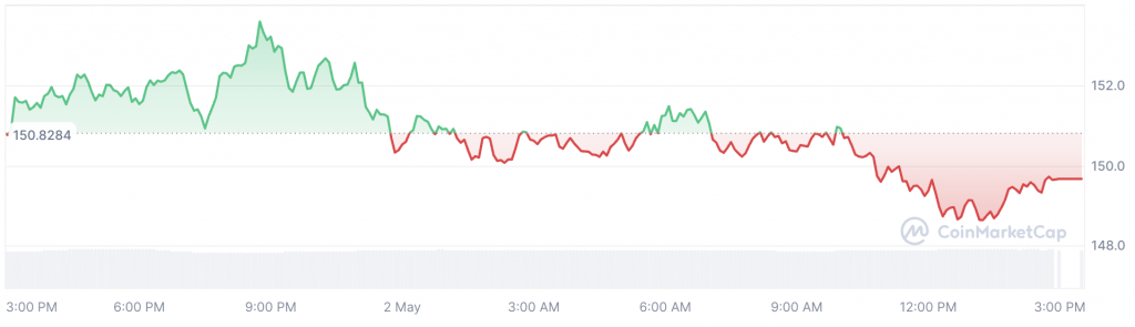 Solana was currently trading for $149.58 at the time this article was written. It follows a drop of 1.17% in the last 24 hours. SOL appears to struggle to hang on to $150. Just a few hours ago, this asset had risen to a price of $153.87.