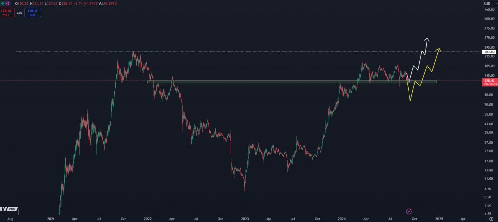 Solana currently trades at $134. A spike indicates that the stock will rise 200%. A $1,000 investment could be worth $3,000 if this forecast is correct.