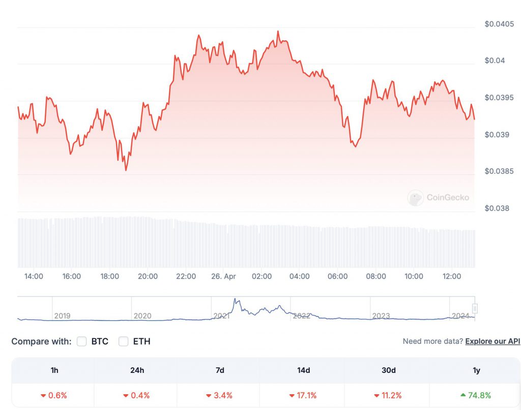 VeChain’s (VET), is currently in the red. The price of this asset fell by 11.2% in comparison to the prior month, 3.4% over the past week, 17.1% for the previous 14 days, and 3.4% during the recent chart. VET’s price has risen nearly 75% in the year-to-date charts since April 2023.