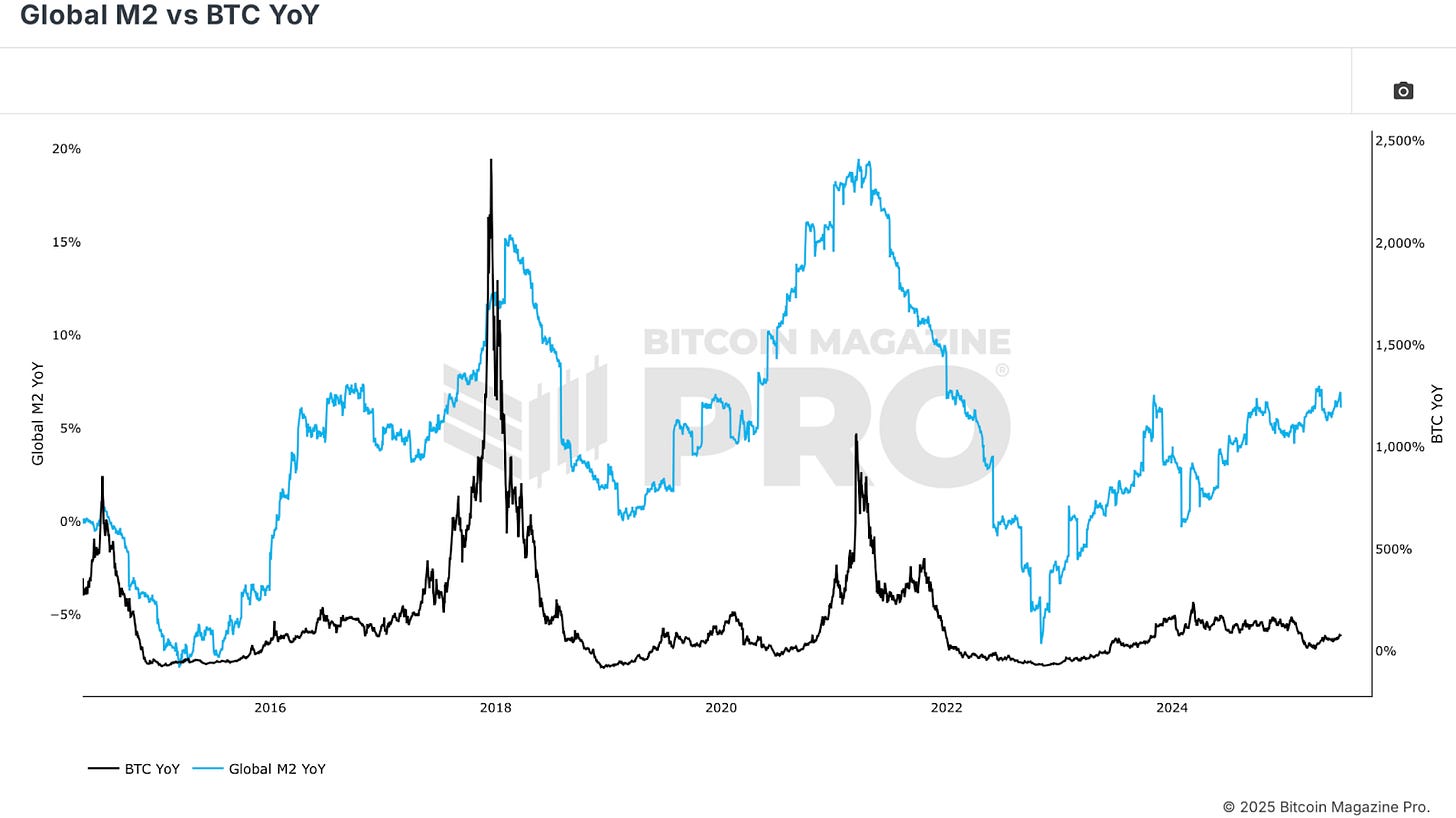 The raw M2 chart may be compelling but viewing it in context is more valuable. Global M2 vs BTC Year-on-Year It provides an actionable perspective. The base M2 is almost always on the rise because governments tend to print more money. The rate at which the acceleration or deceleration occurs tells us a completely different story. Bitcoin usually rallies when the growth rate year-over-year of M2 increases. Bitcoin usually struggles when the growth rate of M2 is negative or falling. Despite the short-term noises, this trend highlights the strong connection between Bitcoin’s bullishness and fiat liquidity growth.