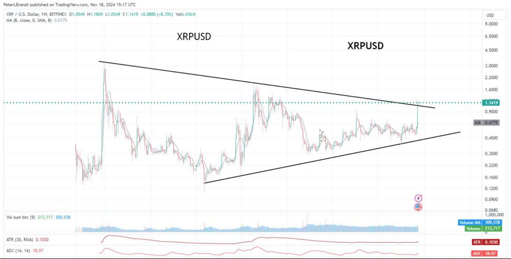 XRP’s price rise is a market highlight as it surpasses $1 and reaches $1.265 by November 2024. The 2024 XRP outlook shows a drastic shift. Peter Brandt Spots a “massive coil” Ripple is poised to move higher as a result of this pattern. Ripple’s recent coin price rise highlights Ripple cryptocurrency’s technological structure. The market is gaining more traction.